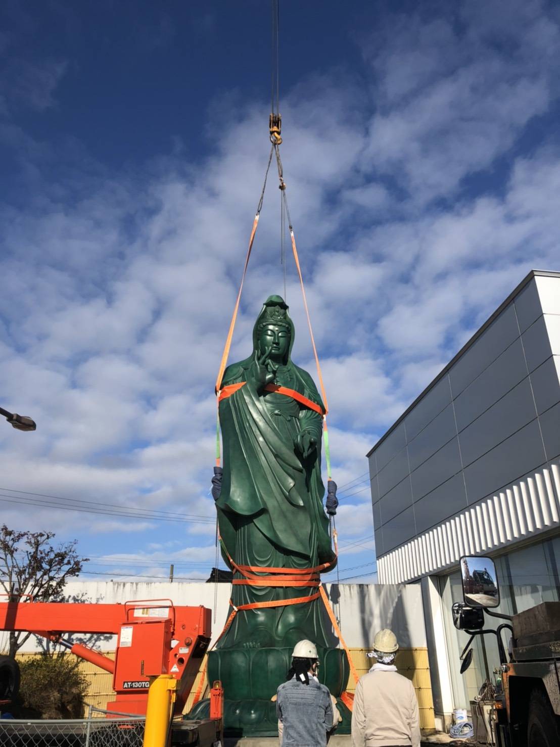 クレーンによる吊り上げでは、急激な動きを避け、ゆっくりと慎重に持ち上げます。吊り上げ中も常に銅像の姿勢を確認し、傾きや揺れが生じないよう細心の注意を払いました。玉掛け技能を持つ技術者が、確実な作業でリスクを最小限に抑えます。